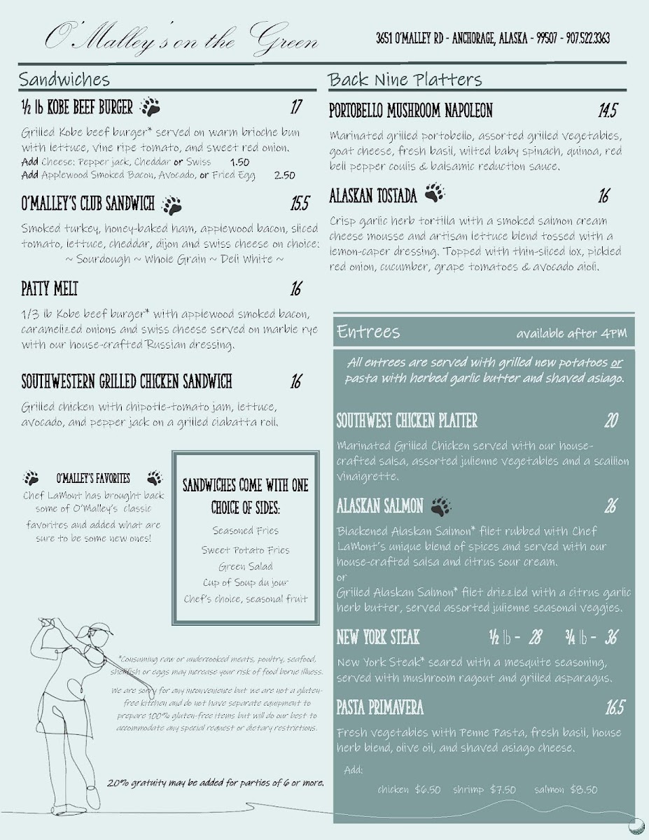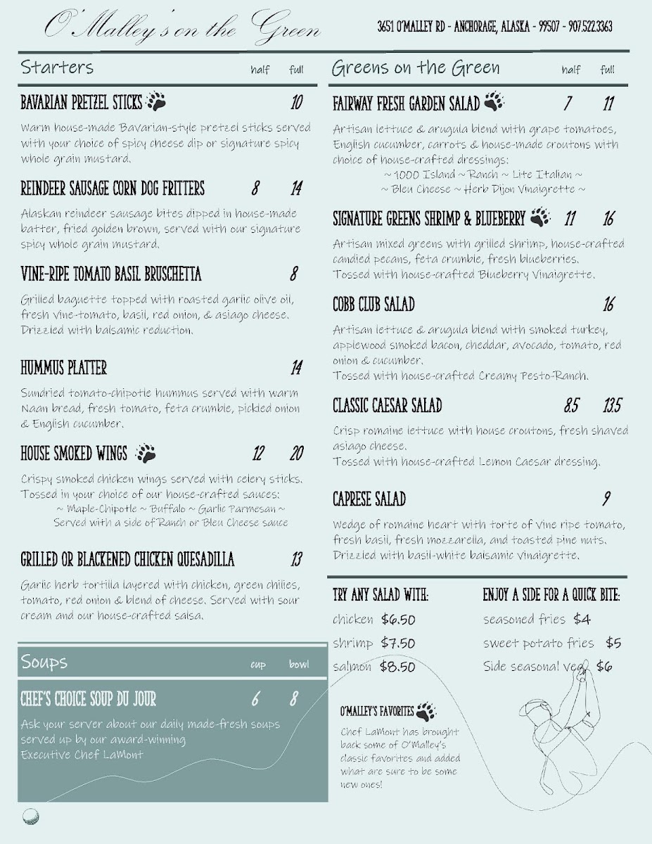The menu at O'Malley's On The Green offers a delightful range of dishes, perfect for any palate. For starters, you can enjoy Bavarian Pretzel Sticks, Reindeer Sausage Corn Dog Fritters, and House Smoked Wings, alongside the refreshing Vine-Ripe Tomato Basil Bruschetta and Hummus Platter. Soups include the Chef's Choice Soup Du Jour, which promises variety. The "Greens On The Green" section features fresh and flavorful options like the Fairway Fresh Garden Salad, Signature Greens Shrimp & Blueberry, and the hearty Cobb Club Salad. If you prefer something more indulgent, the Classic Caesar Salad or Caprese Salad are great choices. For a quick bite, sides like Seasoned Fries, Sweet Potato Fries, and Side Seasonal Veg are available. The sandwich options include the classic O'Malley's Club Sandwich and the spicy Southwestern Grilled Chicken Sandwich. For something a bit different, try the Portobello Mushroom Napoleon or the crispy Alaskan Tostada from the "Back Nine Platters." For the main event, the entrees are sure to satisfy, with choices like the Southwest Chicken Platter, Alaskan Salmon, New York Steak, and the vegetarian Pasta Primavera. Overall, the menu offers a perfect blend of comfort food and inventive dishes, making it a must-visit for anyone in the Anchorage area.
